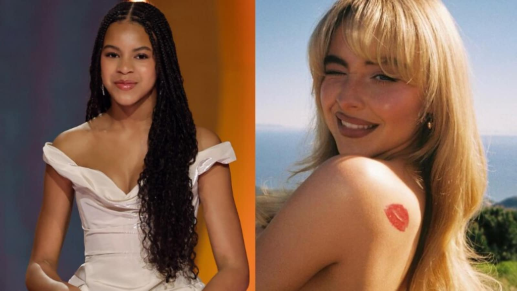 Blue Ivy Carter channeled her inner Sabrina Carpenter at the Espresso hitmaker’s Short n’ Sweet tour stop in Los Angeles. The 12-year-old arrived at Inglewood’s Kia Forum on Sunday, wearing lipstick kisses all over her face to match the fun and flirty aesthetic of the 25-year-old singer.