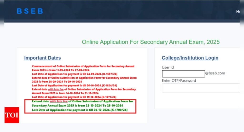 The Bihar School Examination Board has extended the deadline for submitting BSEB Bihar Class 10 and 12 examination forms for 2025. The new deadline, with a late fee, is October 28, 2024. School authorities can visit the official website, seniorsecondary.biharonline.comfor more information. Previously, the last date for form submission was October 22.The fee submission deadline is October 26, 2024. The board announced the news via its