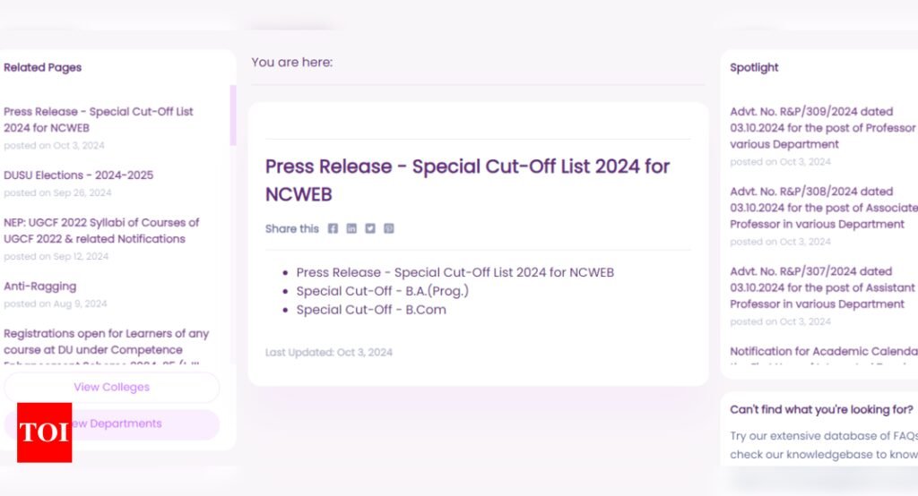 DU NCWEB Admission 2024 Special Drive Cut-off List: The University of Delhi has released the special cut-off list for Non-Collegiate Women’s Education Board (NCWEB), for the academic year 2024-25 on the official website. Candidates can visit the official website to check the cut-off lists released by the University. According to the official notification, the registrations shall begin on October 5, 2024.The special cut-off list is released for students who could not or did not take admission in the previous rounds. Candidates can check the press release notifying the release of the NCWEB special cut-off list. here,