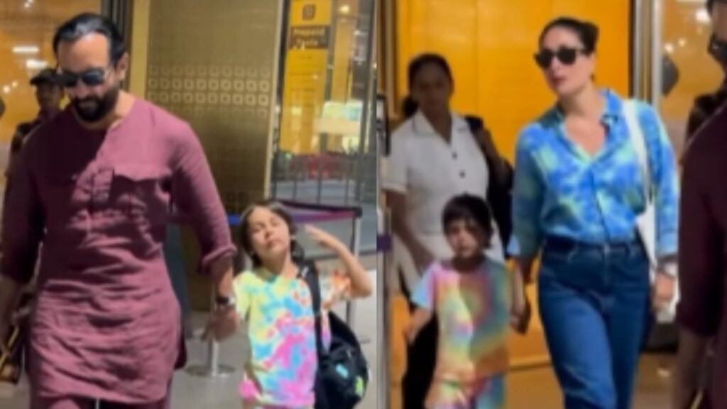 The brothers truly looked like they were coming back from a tropical dreamscape as they emerged from the gates of the Mumbai airport in an adorable little tie and dye co-ord sets. Now while Kareena wasn’t exactly dressed in either a co-ord or a tie and dye set, she nevertheless matched her boys’ vibes in a relaxed blue button down with neon palm tree motifs, still an evident nod to the tropical aesthetic. The shirt was paired with a pair of straight cut jeans, a slick top knot and dark glasses, making it clean and fuss free. Saif on the other hand however, appears to have very much missed the memo on this family moment, opting for a linen kurta set in an earthy brick red. As always, he had a book and some reading glasses in one hand, holding onto Tim Tim on the other, who now all grown up, was carrying his own backpack.