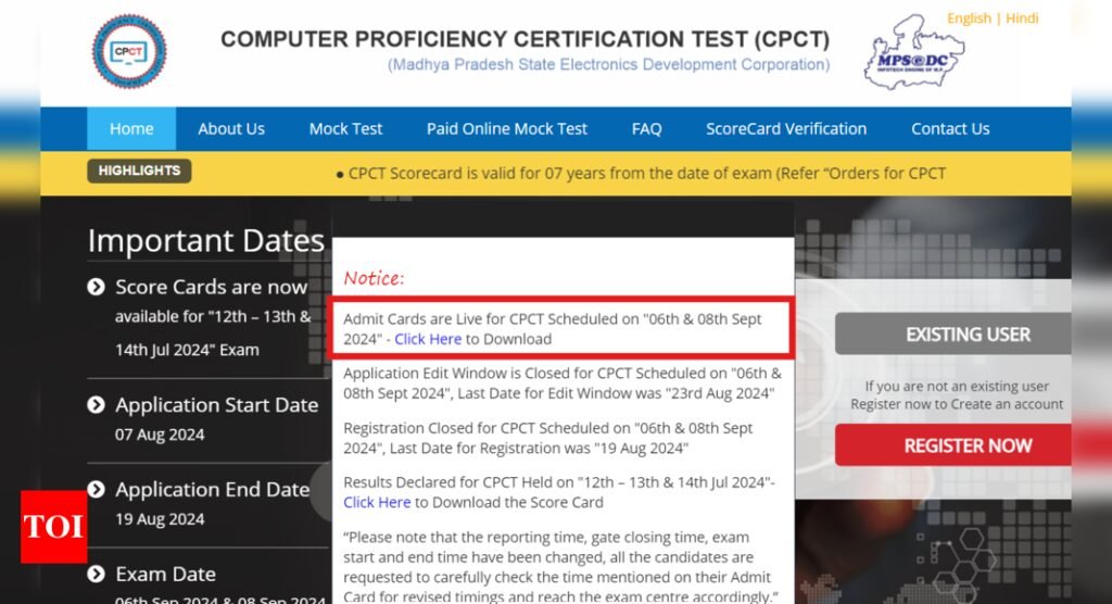 Step 3: Look for the link that says, “Admit Cards are Live for CPCT scheduled on 6th & 8th September 2024 – Click Here to Download” and click on it.