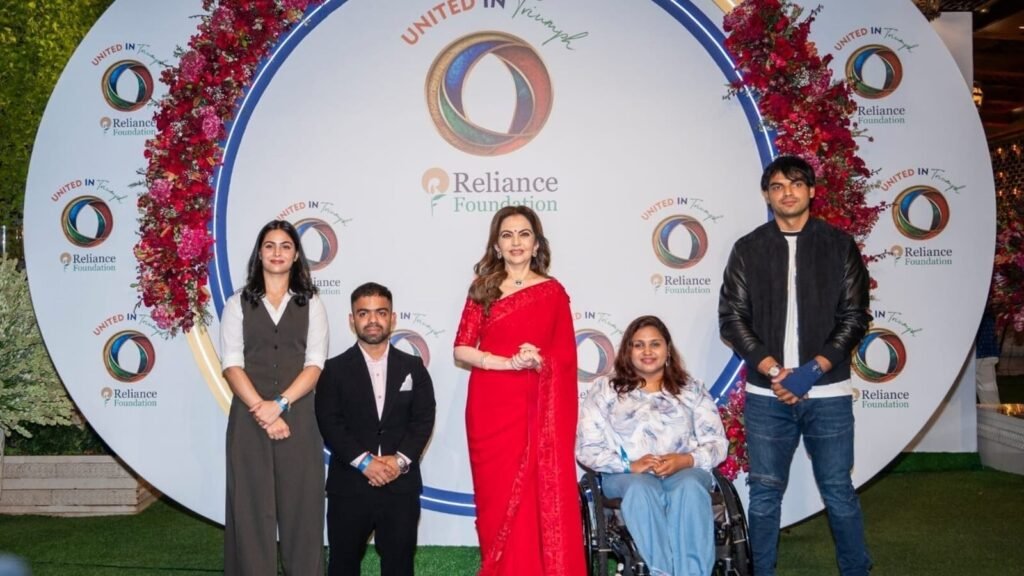 Nita Ambani, resplendent in a red saree, posed with Olympic medalists Manu Bhaker and Neeraj Chopra, and Paralympic medalists Navdeep Singh and Mona Agarwal at the United in Triumph event. She introduced the champion athletes as “Bharat ki Shaan” (Pride of the country),” before requesting assembled photographers to applaud for them.