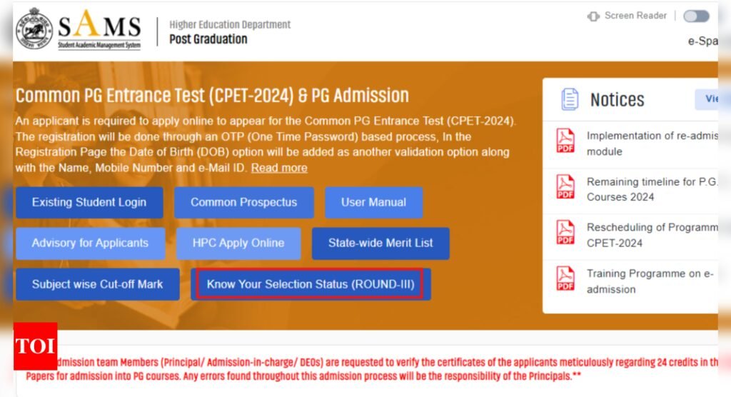 The Higher Education Department of Odisha has released the Round 3 seat allotment results for the Common PG Entrance Test (CPET) 2024 on the official website of the Student Academic Management System (SAMS) Odisha. Candidates can visit the official website, samsodisha.gov.into check the Round 3 seat allotment results. The examination was held from July 3 to 14, 2024.Additionally, only those candidates who participated in the choice-filling process between August 6 and 12 will be included in the seat allotment list.