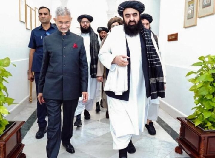 The photograph of the Taliban foreign minister Amir Khan Muttaqi sitting under an old portrait of the...