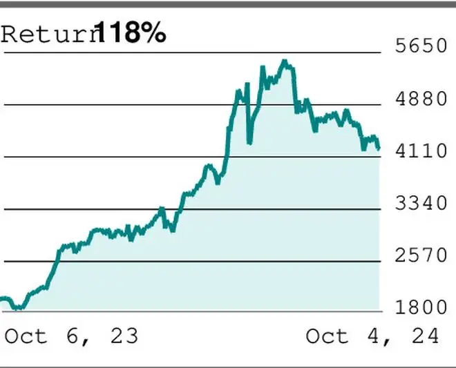Hindustan Aeronautics Limited (₹4,256.40): The stock made a new high of ₹5,675 in July this year and has come down. Prior to this fall, the stock was in a strong uptrend. The fall from the July high signals that the uptrend is getting reversed. Strong resistances are at ₹4,600 and ₹4,850. As long as the stock trades below ₹4,850, the outlook will remain negative.